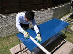 定寸に切断したガラスをサッシに入れて、サッシを固定します。