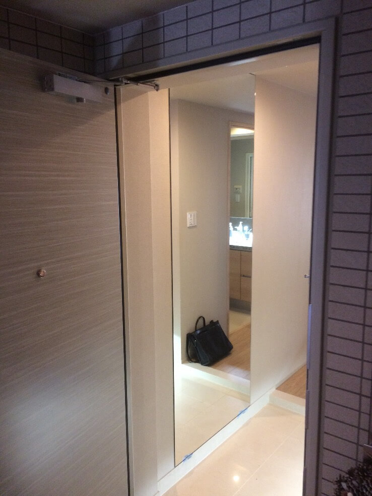 玄関にこれだけ大きなオーダーミラーを設置するとマンションの高級感が増し、やってくるお客さんもビックリすることと思います。